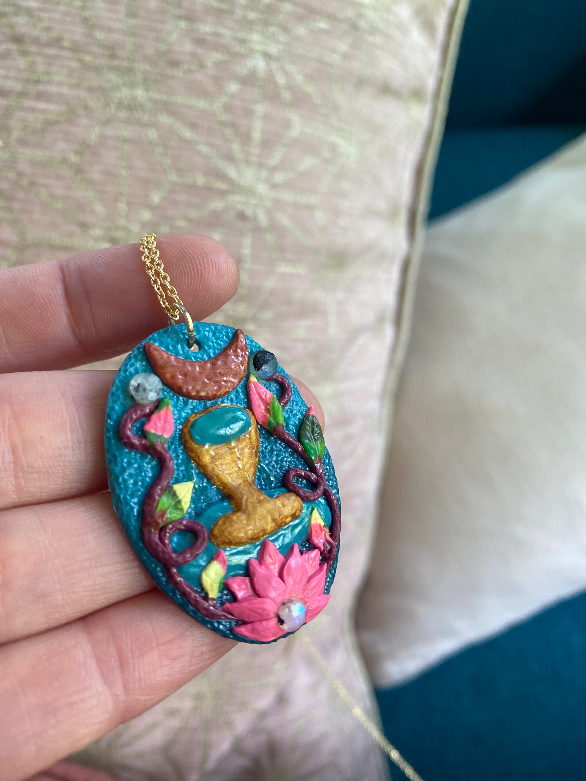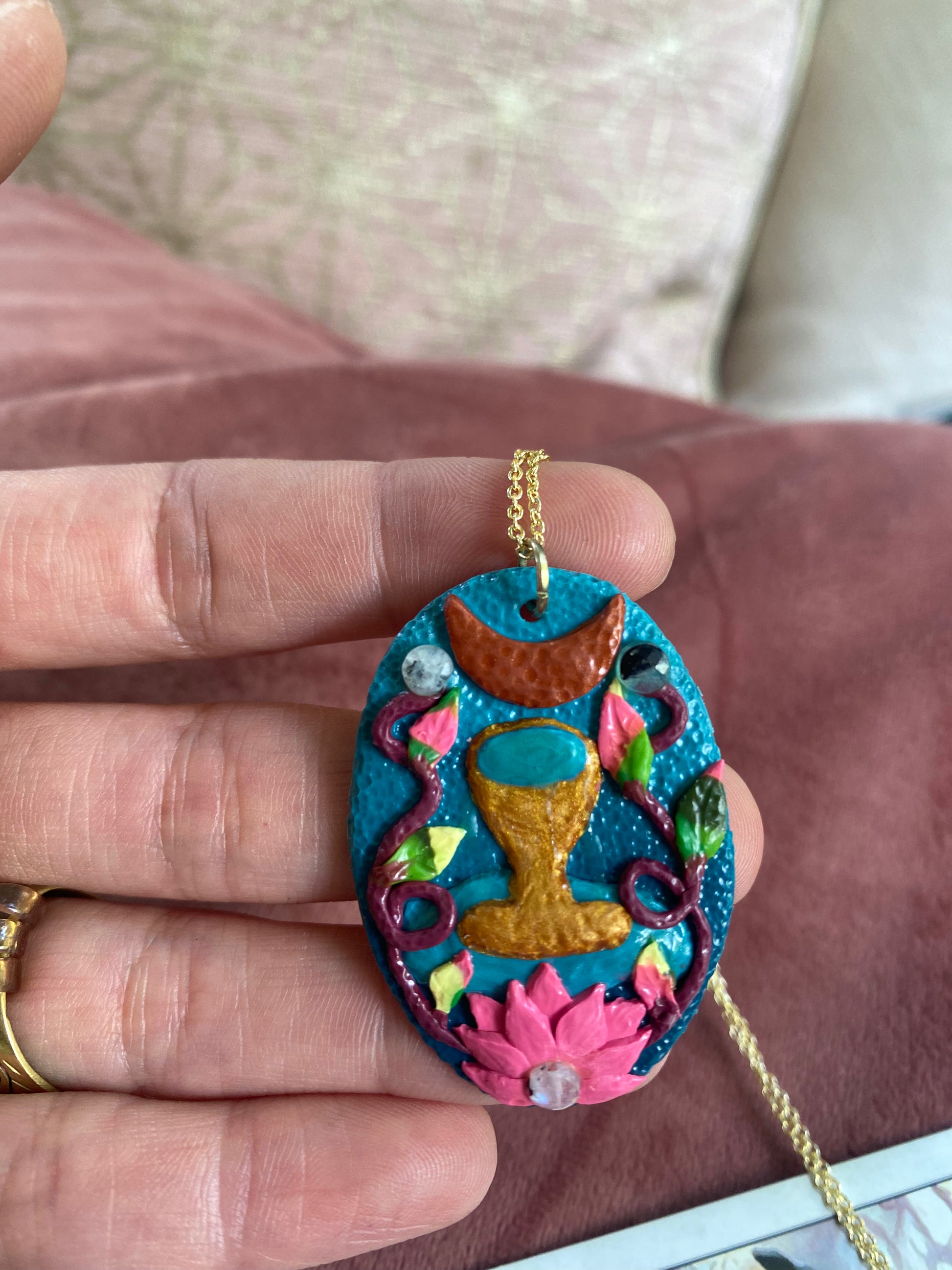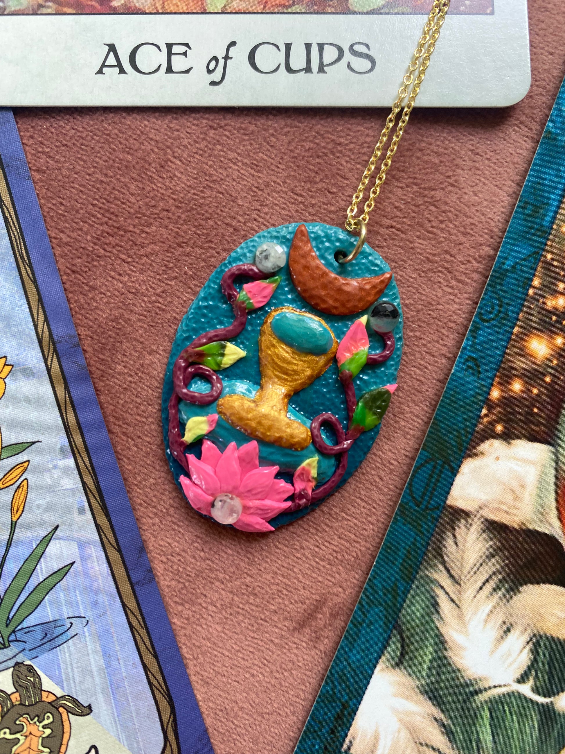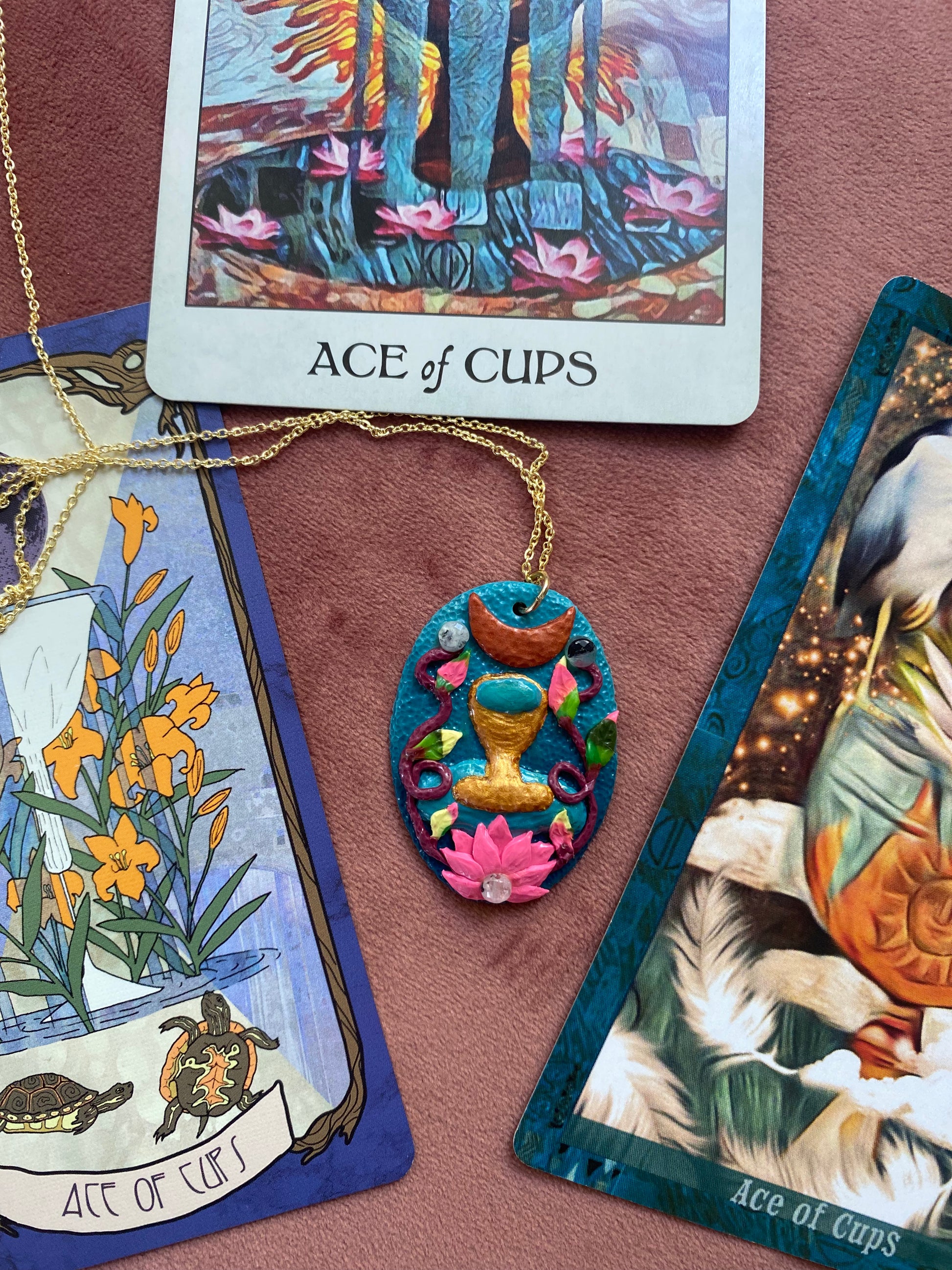 This pendant represents my interpretation of the Ace of Cup in tarot. With the Ace of Cups, Divine love and compassion are pouring through you. You are a vessel for deep, spiritual love from the Universe, and you can’t help but let that love flow through you and into the world. You receive love, you give love, you ARE love. Your heart overflows.